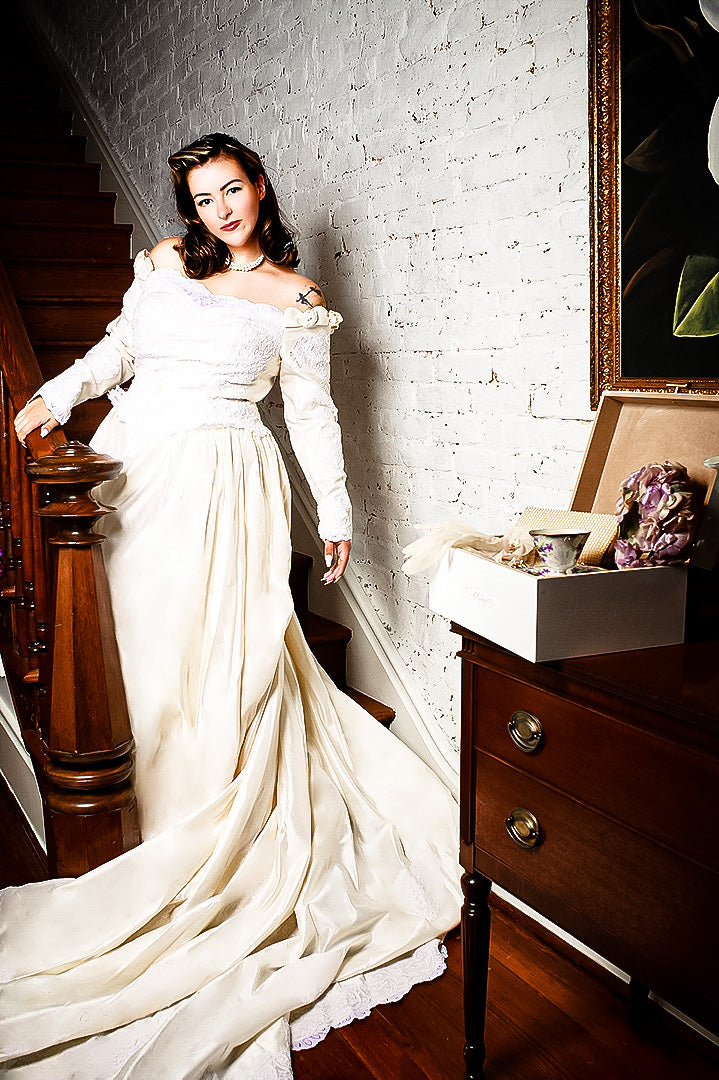 Vintage 1980s Beaded Long Sleeve Wedding Gown – Size L